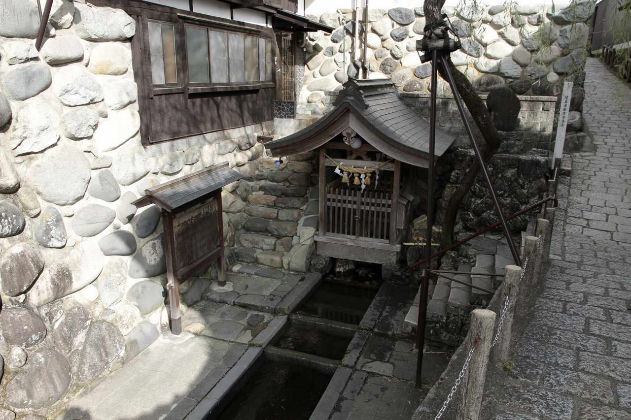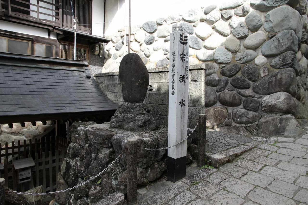 商店が立ち並ぶ一画と川岸付近の通路に挟まれた一画に宗祇水はあります。