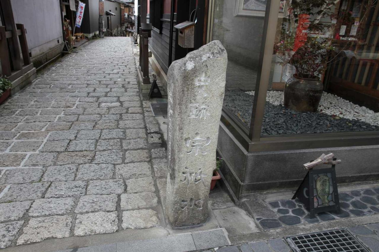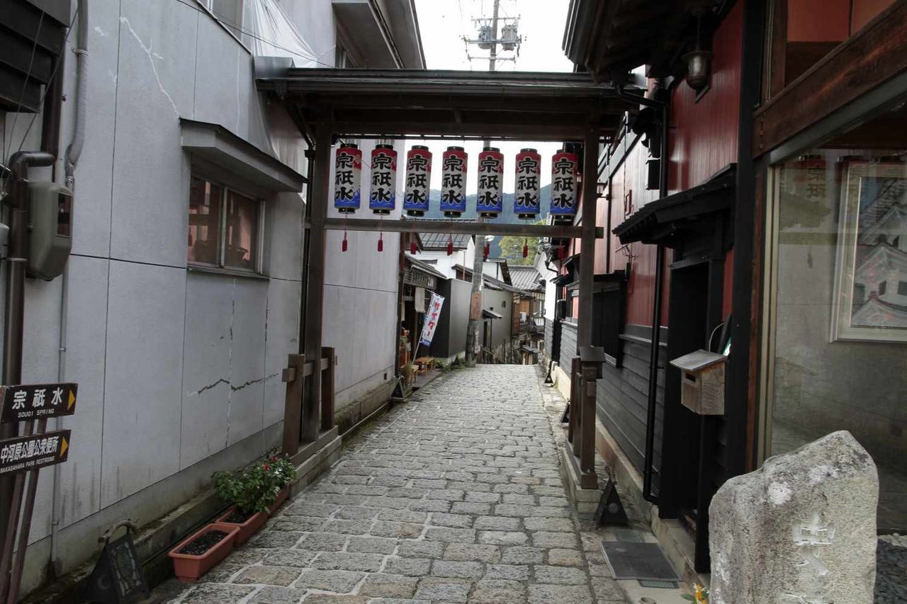 宗祇水へは町中心部のとある場所から川方面へと下る石畳道を進み