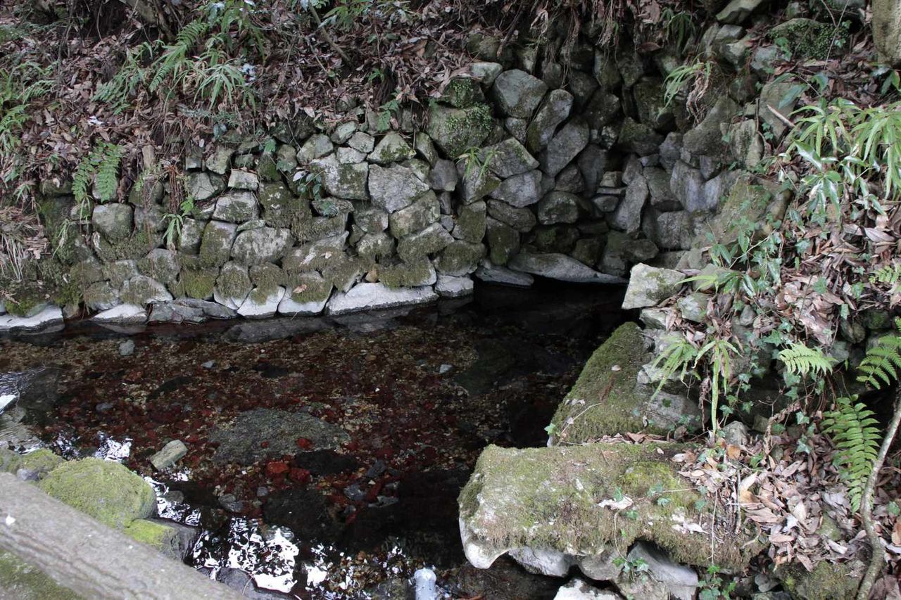 水くみ場の奥にある木橋を渡って下を見ると、湧き出た水が