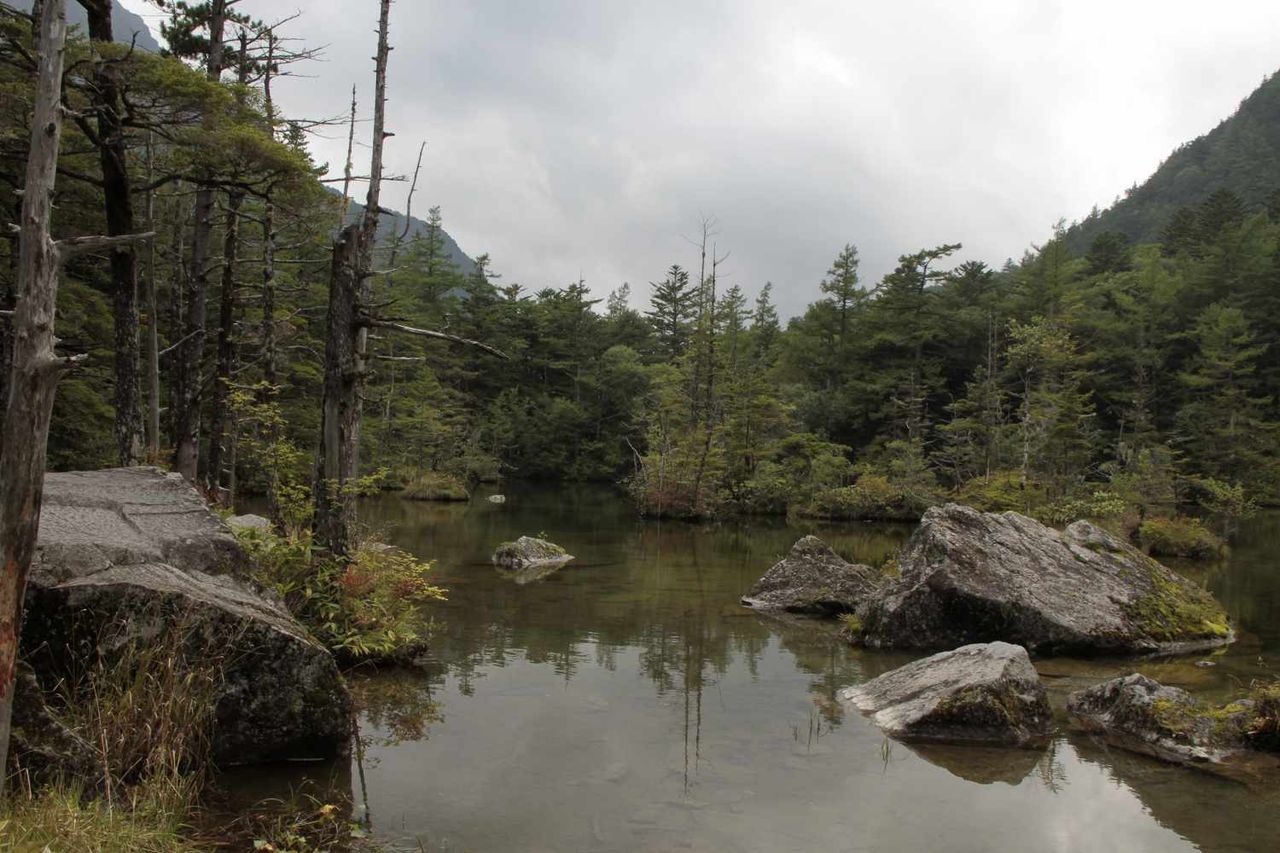 立ち枯れ木と大きな岩が点在する明神池の姿などが楽しめる事から