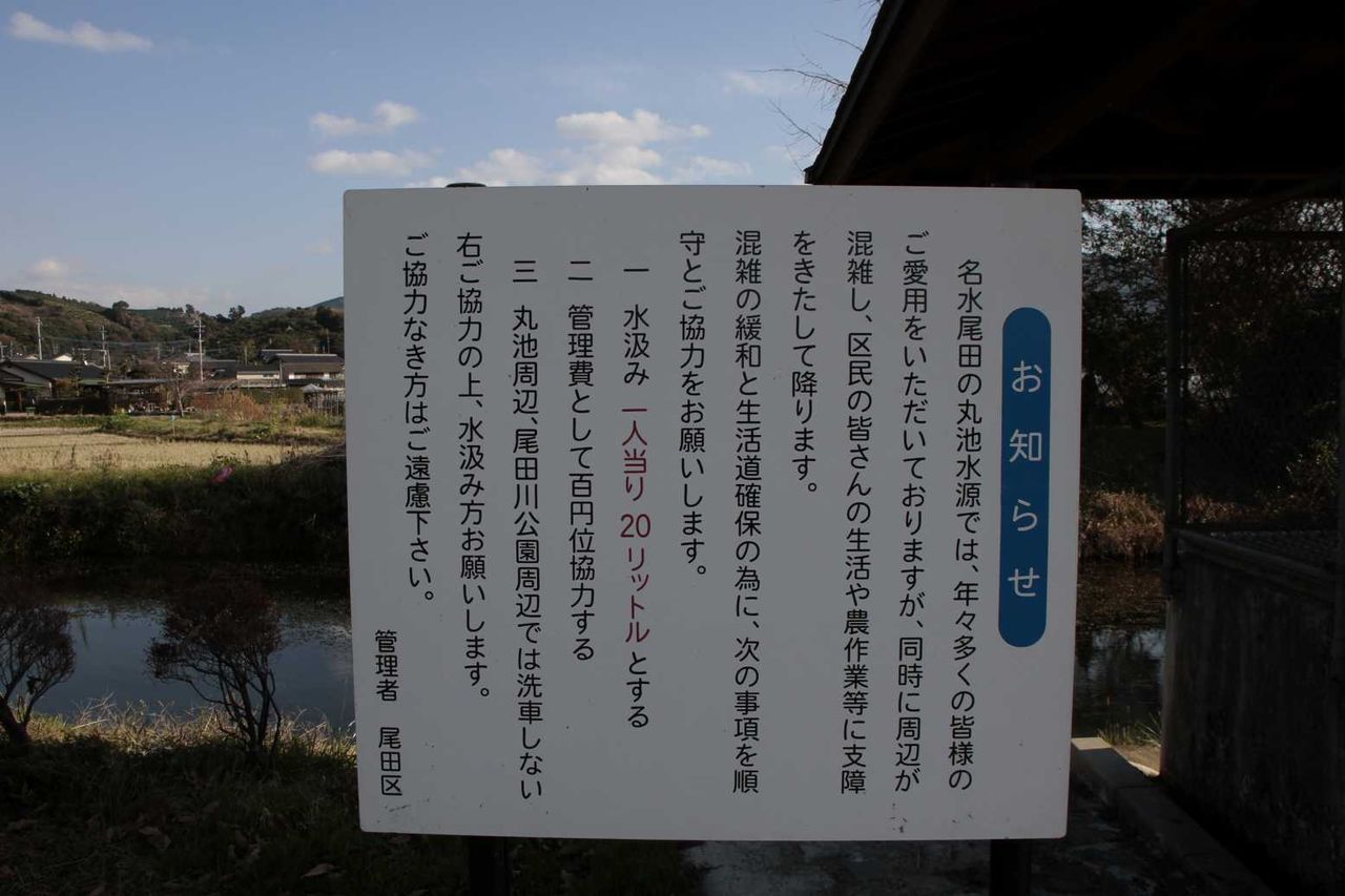 水飲み場の前には、尾田の丸池の水飲み場を使用する際の注意書きがあり
