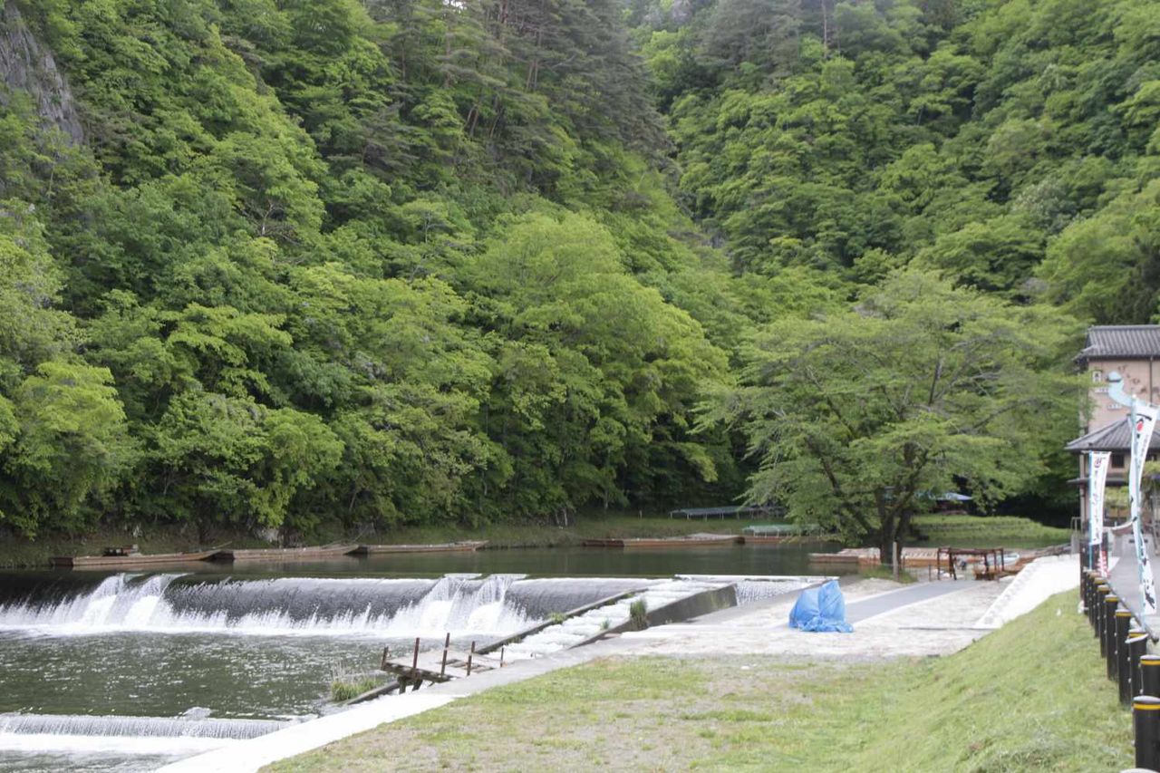 電車高架下から猊鼻渓の入り口へと到着する頃、高架下から音が聞こえるので振り向くと