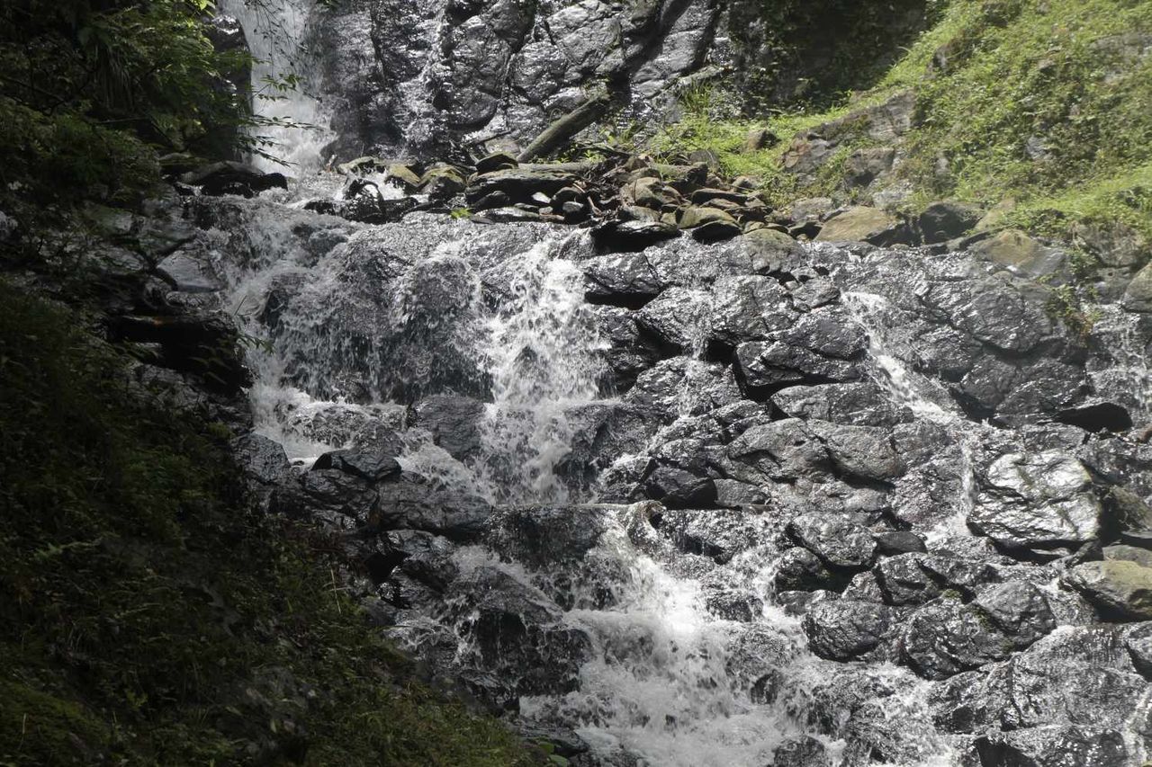 滝下の川の中の岩の上で、トンボが羽根を休めていました。