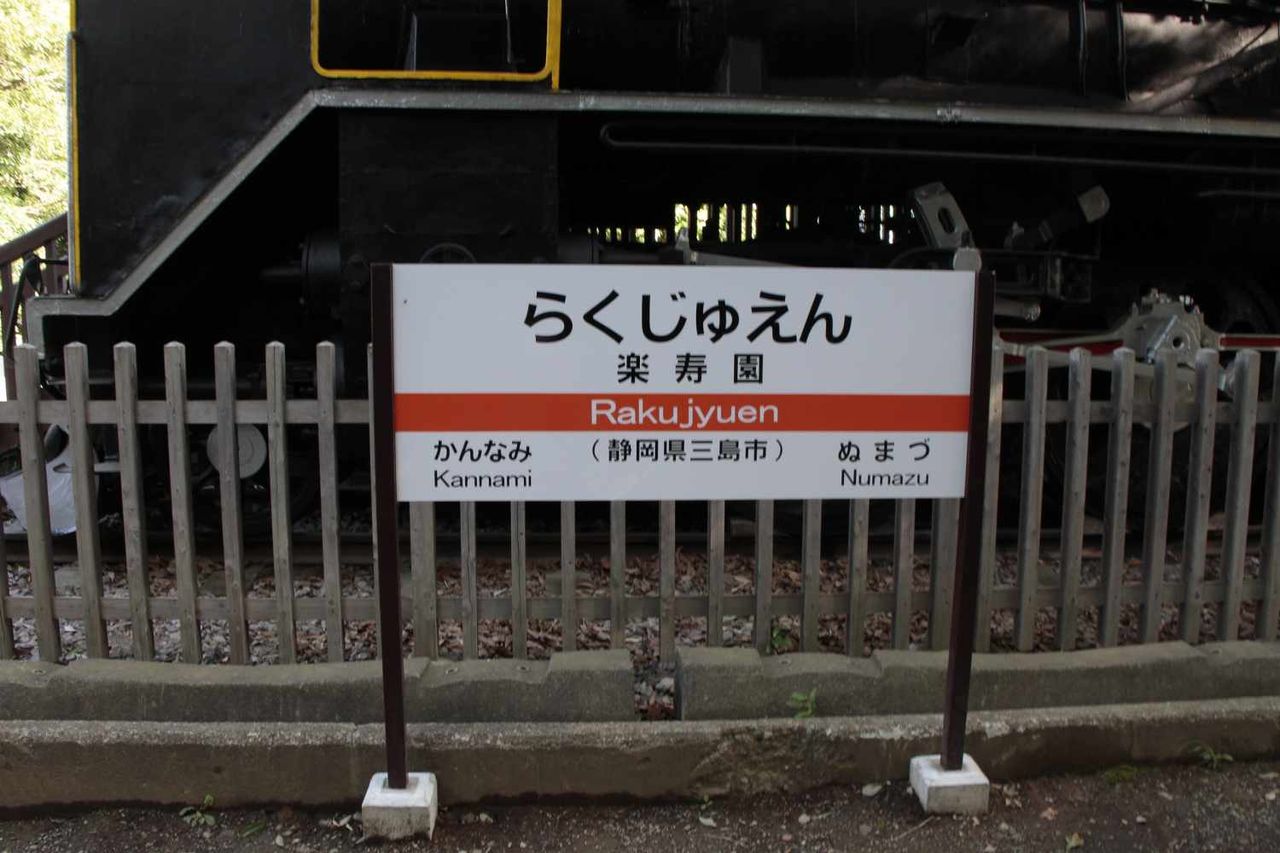 SLの前にはJR東海の駅表を模した楽寿園駅の札が掛けられていました。