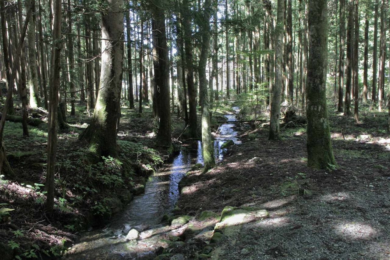 泉の森に入って水源へ向けて歩いて行くと、源泉から流れ出る水が川のように流れている場所を発見し
