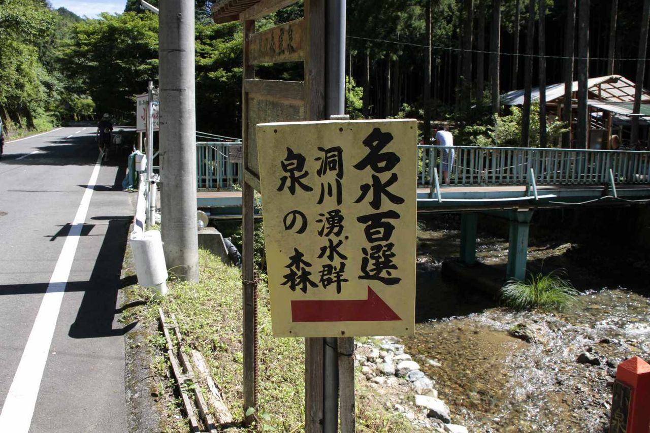 洞川湧水群の一つである泉の森へは、賑やかな温泉街の対岸を通り住宅地が広がる通りを進み